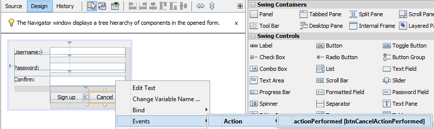 Chọn chế độ Design -> chuột phải lên thành phần muốn xử lý sự kiện -> chọn Events -> lựa chọn loại sự kiện muốn xử lý. Bên dưới là ví dụ về đăng ký sự kiện cho nút nhấn Cancel (Sự kiện click).