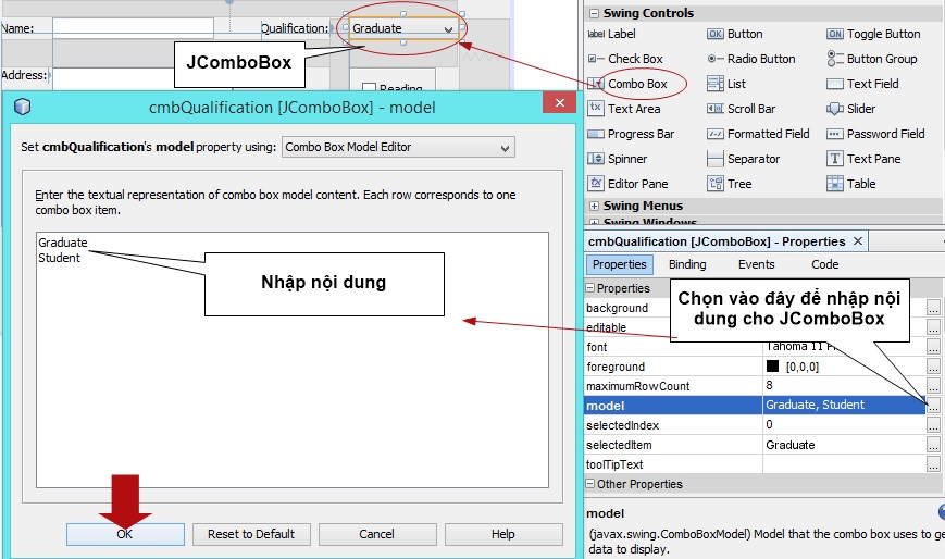 JComboBox là thành phần cho phép người dùng lựa chọn từ danh sách thả xuống (dropdown list). Hình bên dưới là cách tạo JComboBox và thêm nội dung hiển thị. Kết quả thu được sau khi chạy ứng dụng