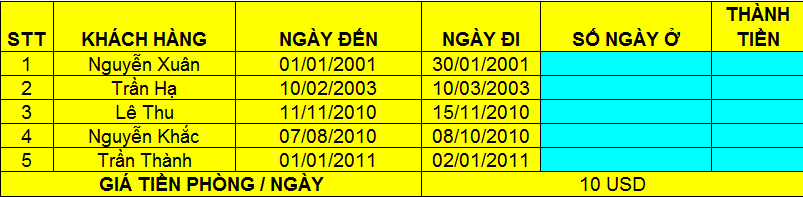 Bài thực hành số 1. Lập công thức tính Số ngày ở và Thành tiền của khách hàng tại một khách sạn ABC.