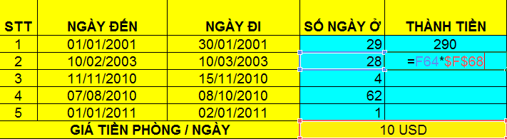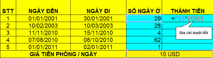 Khi chúng ta thực hiện sao chép công thức để tính cột thành tiền cho người có stt 2 thì công thức lúc này sẽ là F64-$F$68; nghĩa là F63 thành F64 (địa chỉ tương đối) nhưng $F$68 thì không thay đổi (địa chỉ tuyệt đối)